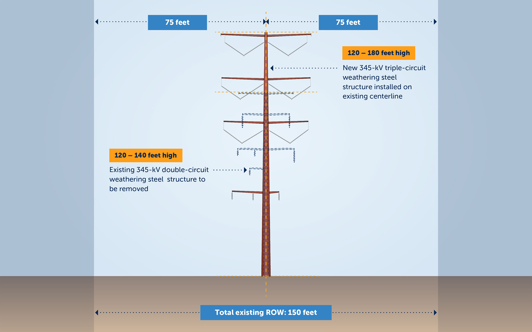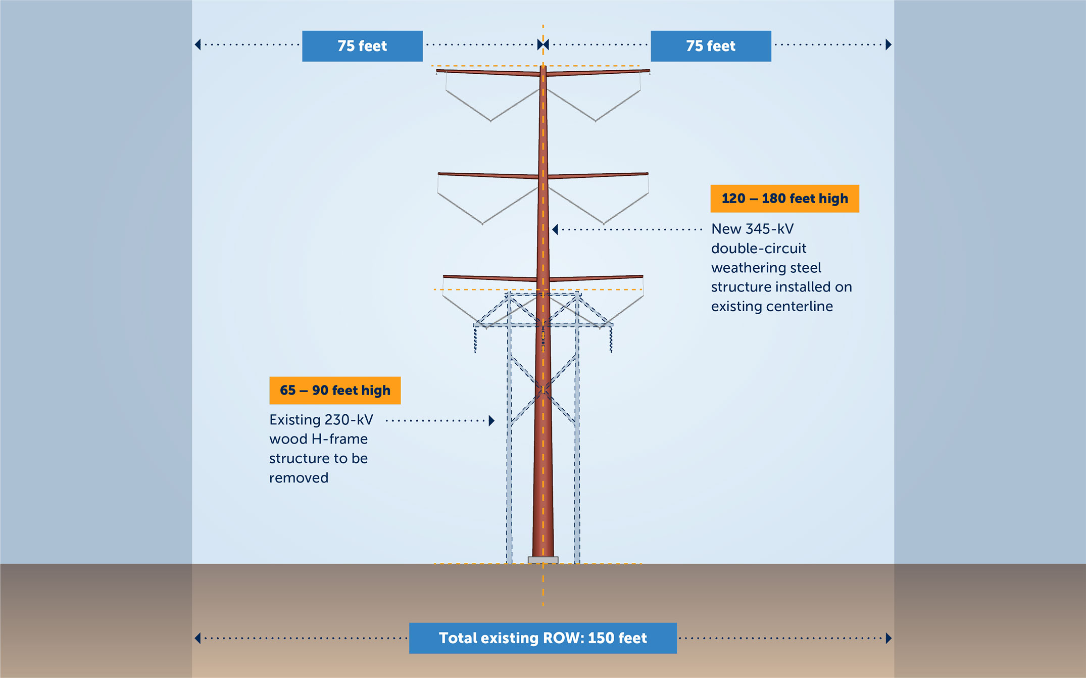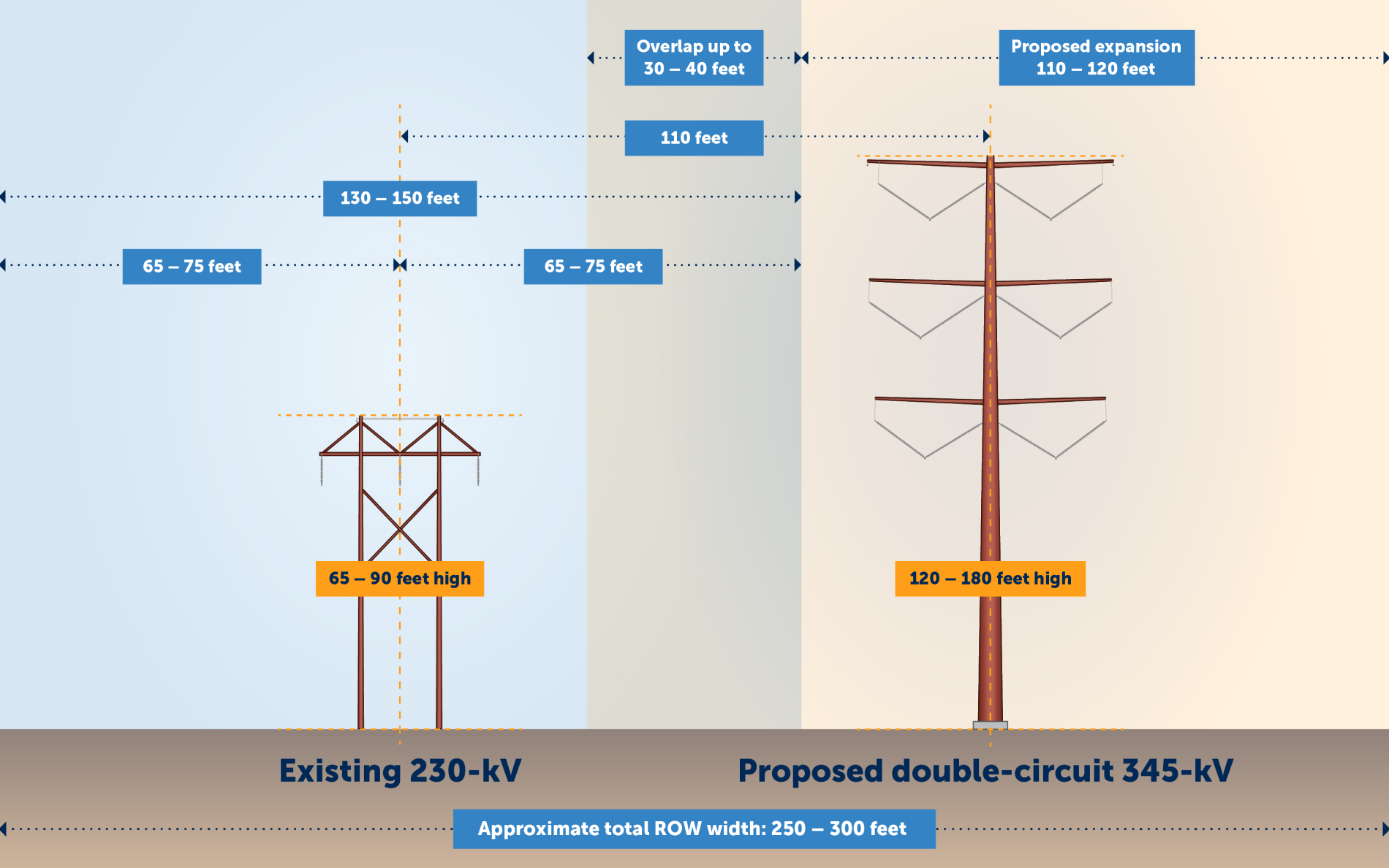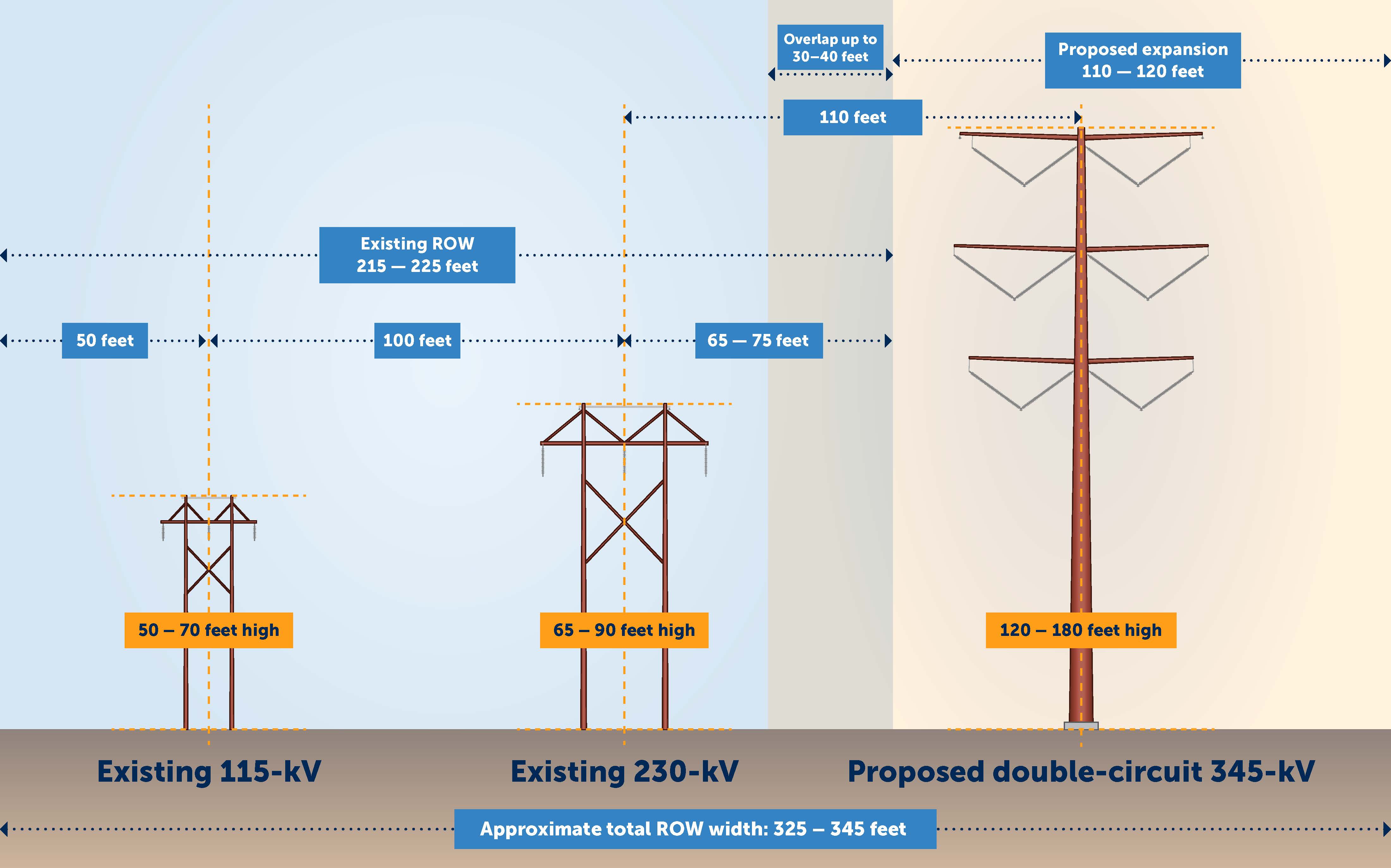 There may be opportunities to overlap ROW with an existing line. We estimate up to 30-40 feet of ROW may be shared between the existing structure and the new structure depending on factors like engineering, construction and topography.